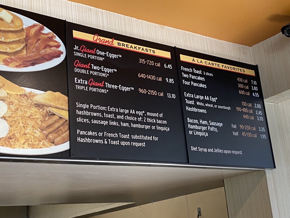 1 extra large AA grade egg. Your choice of meat served with single portion of hash browns and choice of toast. Or substitute with 2 pancakes or 1 slice of French toast.