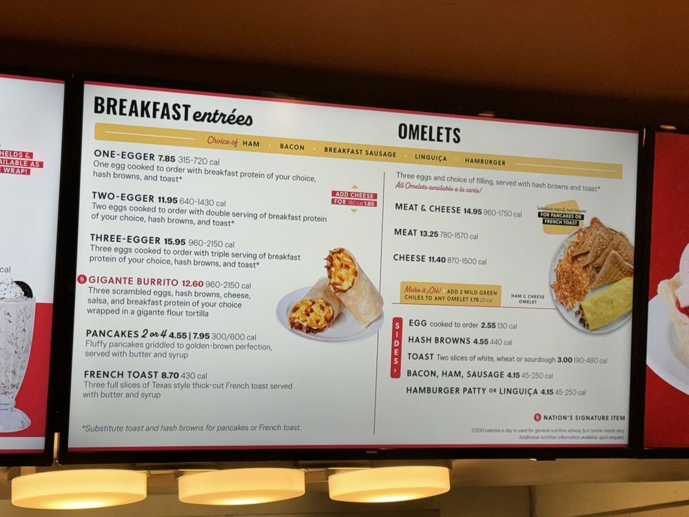 3 extra large AA grade egg omelette with choice of meat served with hash browns and choice of toast. Or substitute sides with 4 pancakes or 2 slices of French toast.
