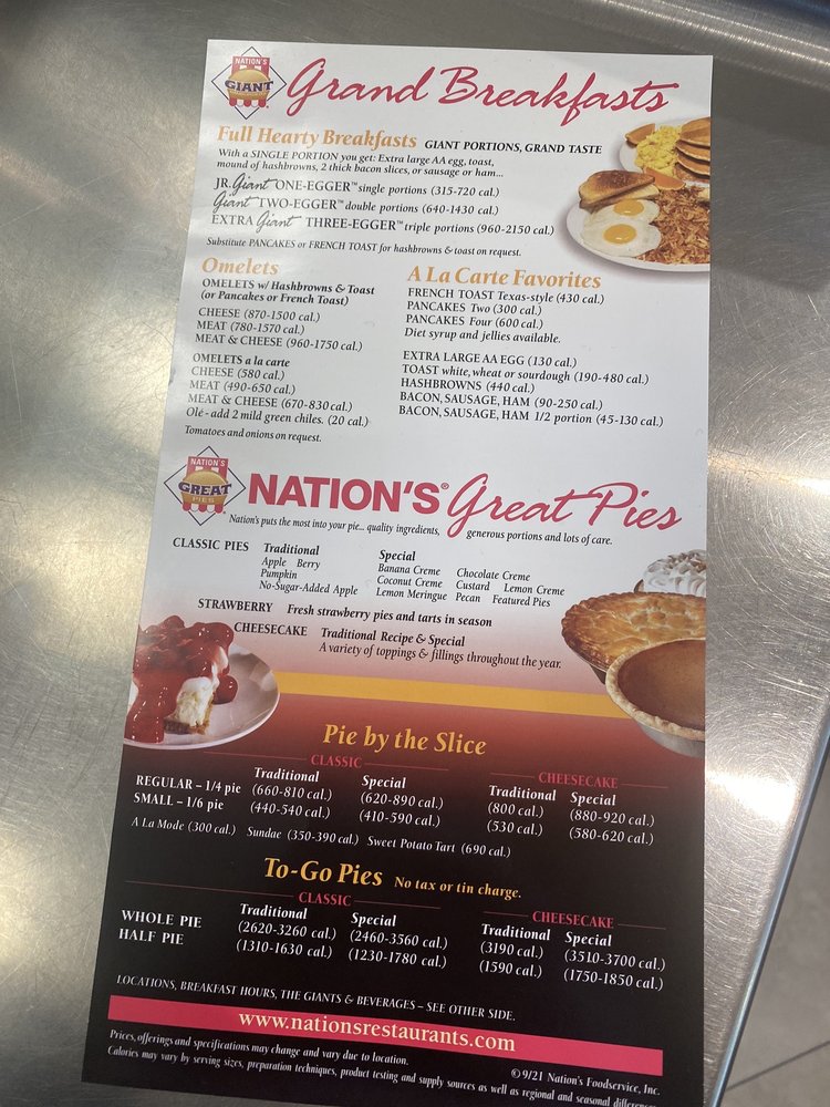 Nation’s Giant Hamburgers is a beloved establishment offering a wide range of burgers, breakfast options, and delectable desserts. Located in Tracy, CA, this restaurant provides amenities such as delivery, takeout, and Wi-Fi, making it a convenient choice for all diners. From fluffy pancakes to savory egg dishes, the breakfast menu is sure to satisfy any morning craving. The half pies selection boasts tantalizing flavors like apple, berry, and chocolate crème, perfect for those with a sweet tooth. Customers praise the generous portions and fresh ingredients used in their meals, with many recommending the cheeseburger and pies as must-try items. The friendly staff and clean ambiance add to the positive dining experience at Nation’s Giant Hamburgers. So, whether you're in the mood for a hearty burger or a delightful dessert, this restaurant promises a delightful and satisfying meal.